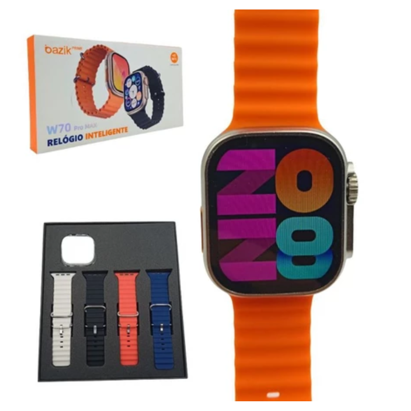 Por que escolher o W70 Pro Max? Monitoramento completo da saúde: Acompanhe seus batimentos cardíacos, passos, calorias queimadas e qualidade do sono. Notificações inteligentes: Receba notificações de chamadas, mensagens e redes sociais diretamente no seu pulso. Diversas funções: Controle sua música, encontre seu celular, tire fotos remotamente e muito mais. Design moderno e confortável: Disponível em diversas cores e com pulseiras intercambiáveis para combinar com seu estilo. Bateria de longa duração: Use seu smartwatch por dias sem precisar recarregar. Ideal para: – Quem busca um estilo de vida ativo e saudável. – Pessoas que valorizam a praticidade e a tecnologia. – Aqueles que querem estar sempre conectados, sem perder o estilo. Não perca mais tempo e adquira já o seu Bazik W70 Pro Max!